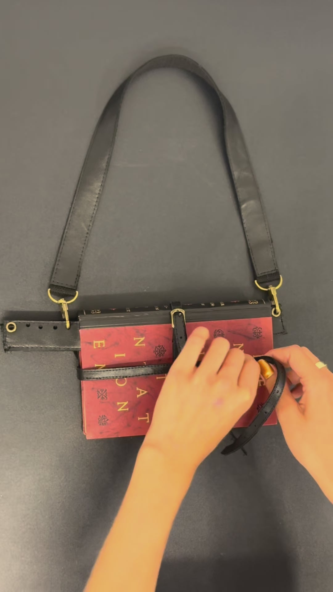 This bag acts as a literary companion and can carry almost every book. The book or magazine is tightly kept in place through two straps. The whole system is adjustable and showcases what you are reading while your bag never takes up more space than the book you want to bring. A small additional 11x20cm bag has enough room to carry essentials. The bag is made out of sheep and cow leather with brass hardware.
