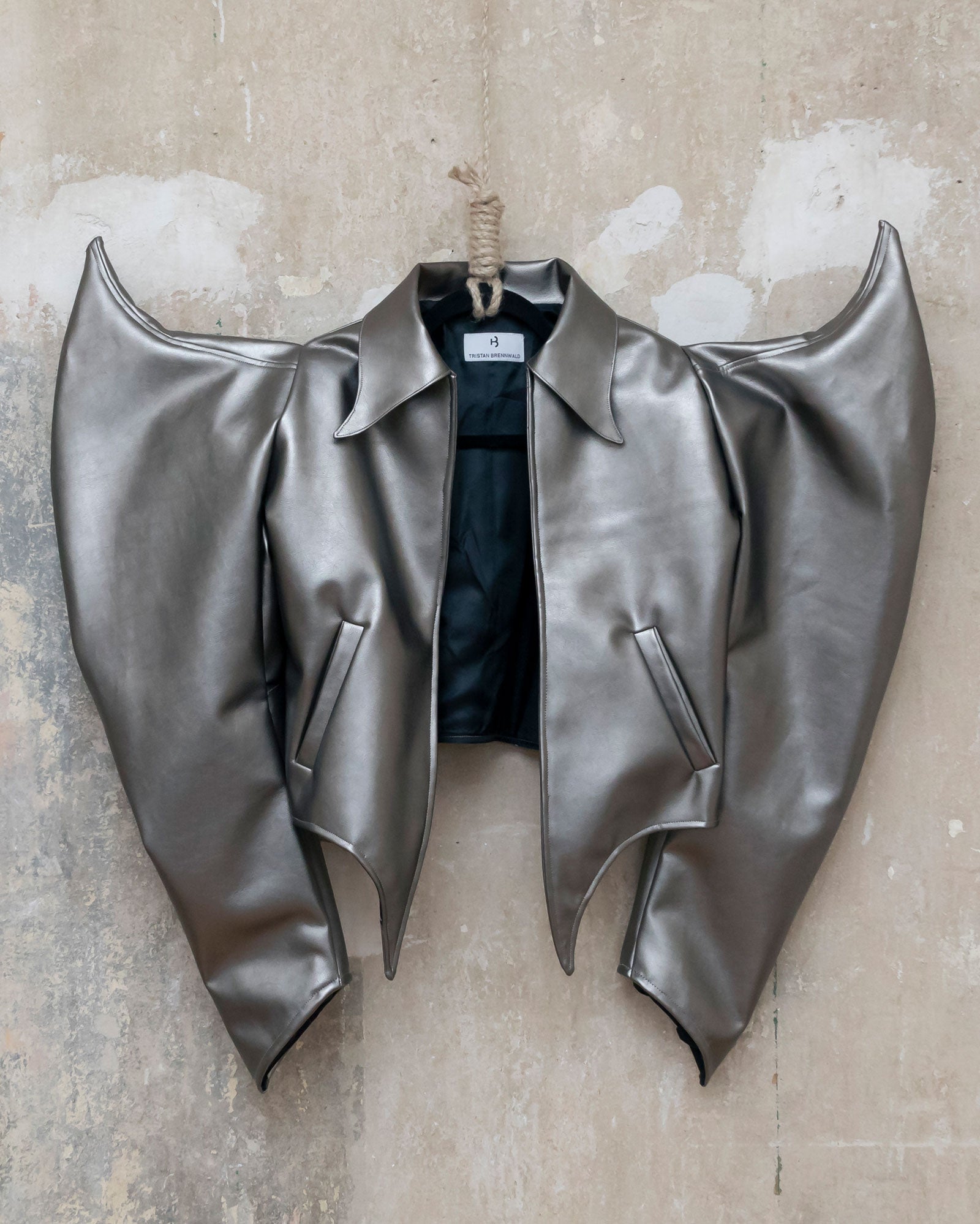 Stiff silver faux leather jacket with sleeves that look like fangs. Pockets on the front and inside. Please allow around 2 weeks for production